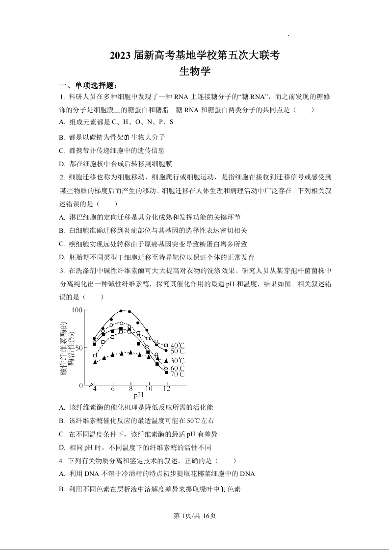 高三生物+答案--江苏省新高考基地学校2022-2023学年高三下学期第五次大联考