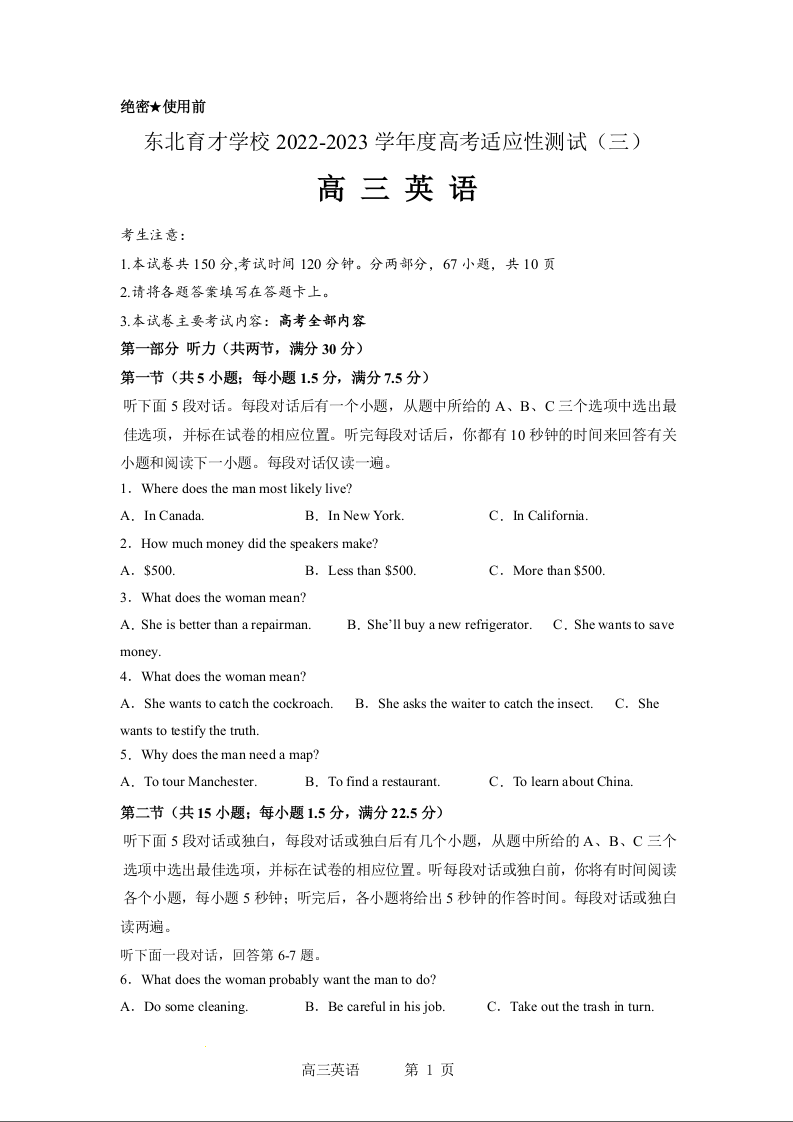 高三英语--辽宁省沈阳市东北育才学校2023届高三 三模