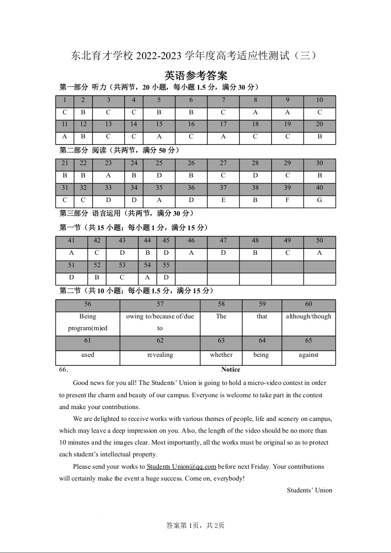 高三英语答案--辽宁省沈阳市东北育才学校2023届高三 三模
