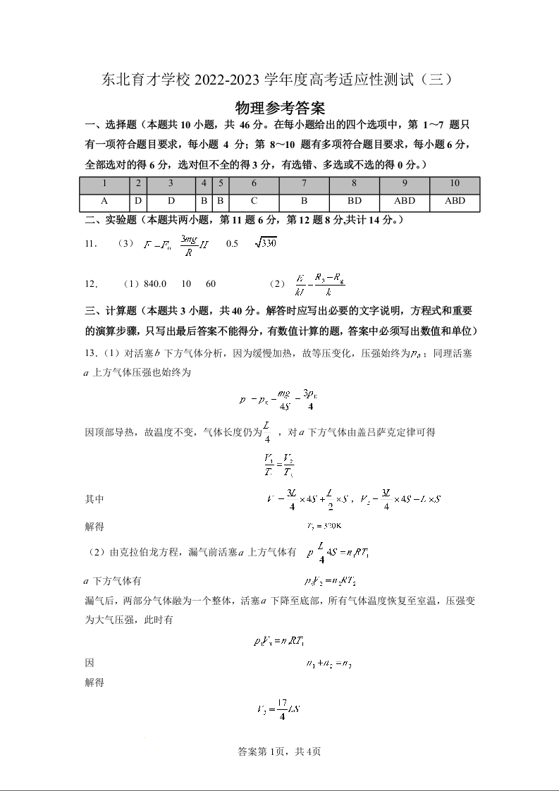 高三物理答案--辽宁省沈阳市东北育才学校2023届高三 三模
