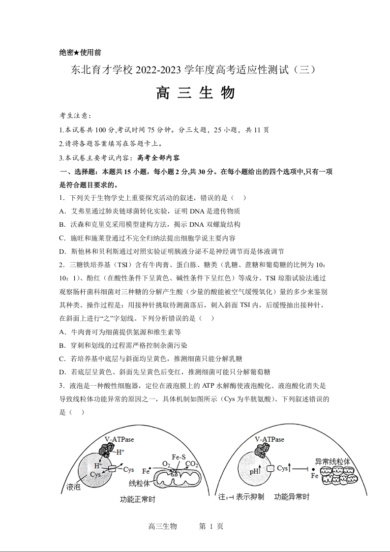 高三生物--辽宁省沈阳市东北育才学校2023届高三 三模