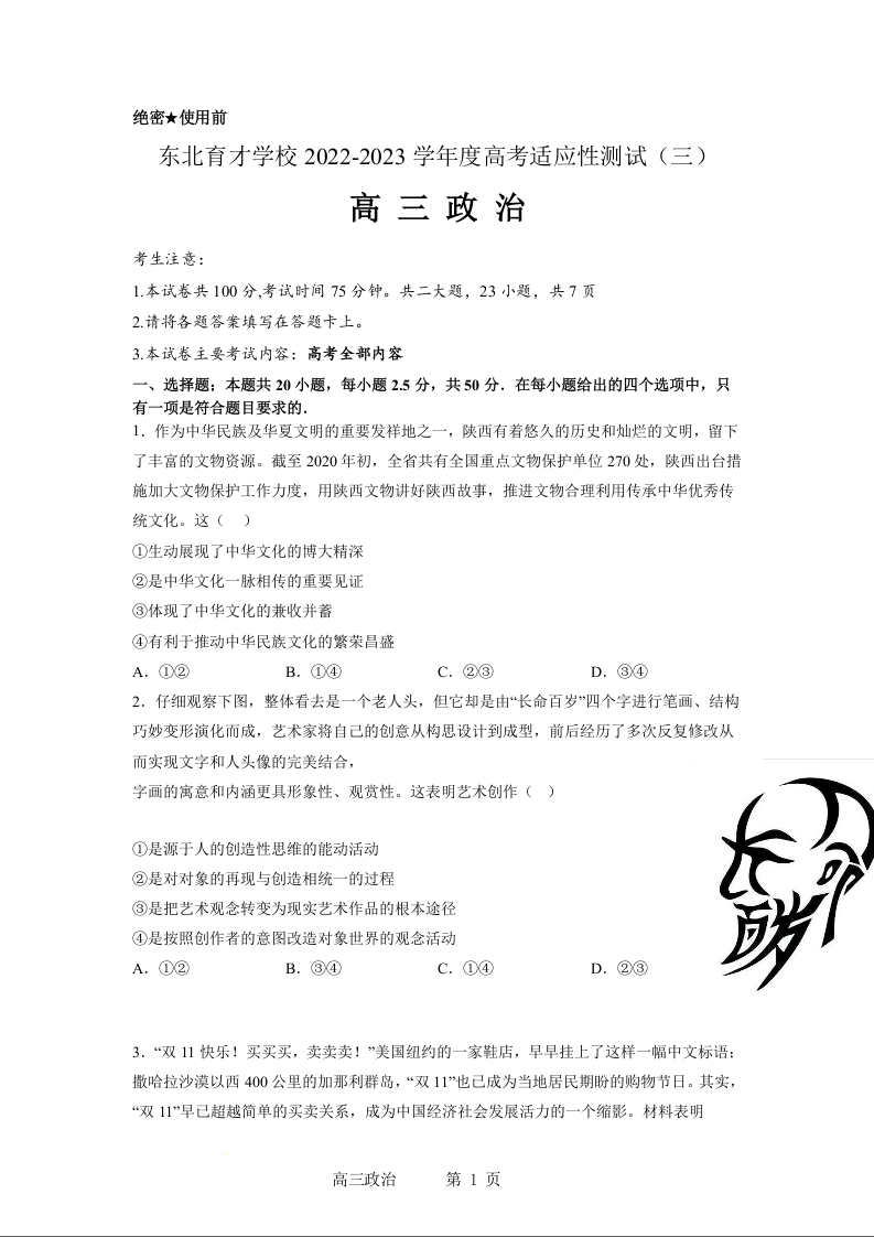 高三政治--辽宁省沈阳市东北育才学校2023届高三 三模