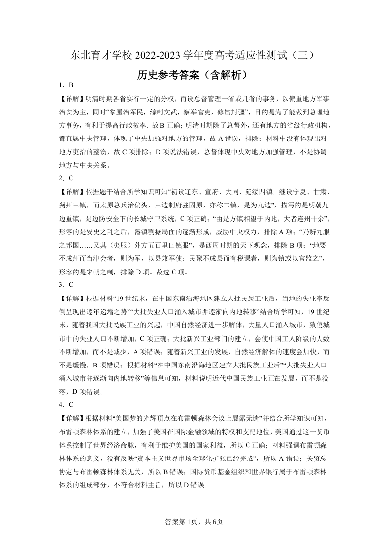 高三历史答案--辽宁省沈阳市东北育才学校2023届高三 三模