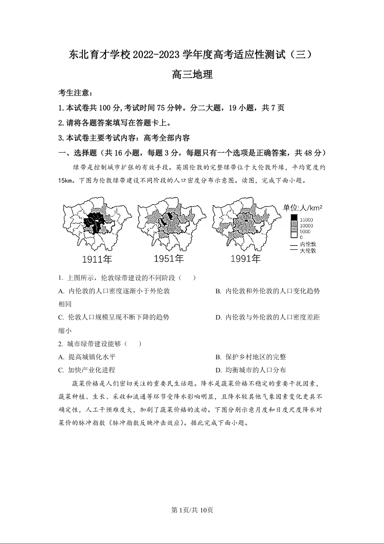 高三地理(原卷版)--辽宁省沈阳市东北育才学校2023届高三 三模