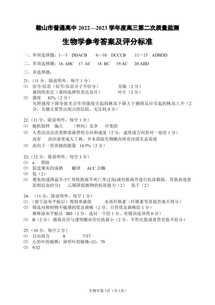 高三生物答案--辽宁省鞍山市普通高中高三第二次质量监测