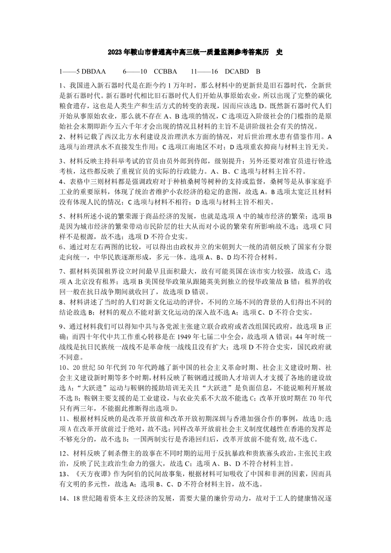 高三历史答案--辽宁省鞍山市普通高中高三第二次质量监测