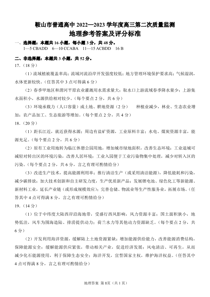 高三地理答案--辽宁省鞍山市普通高中高三第二次质量监测