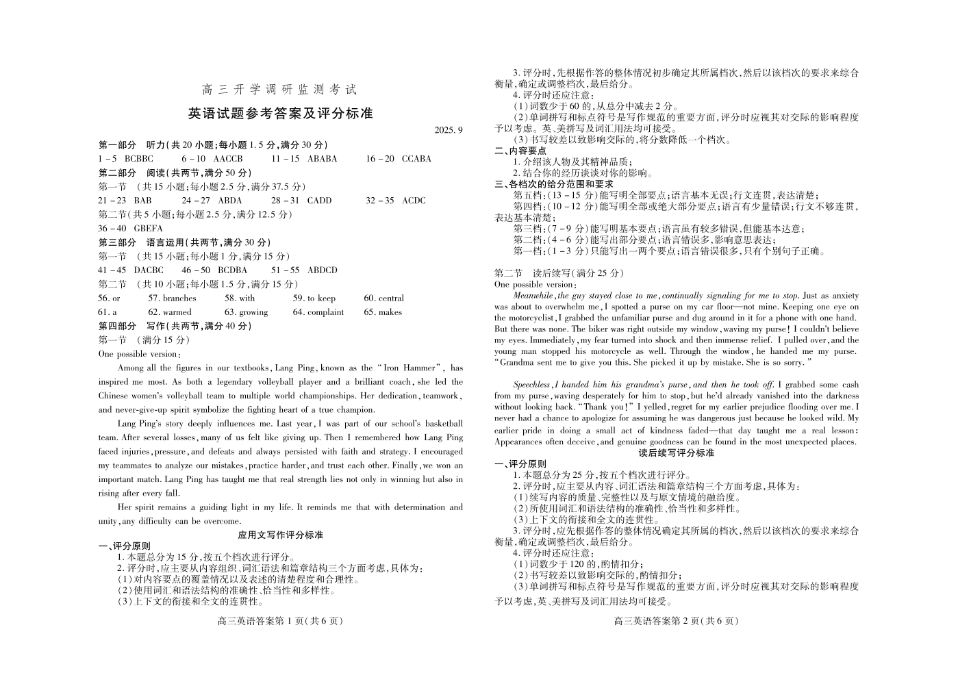 高三英语答案(山东省潍坊市2025.9开学调研监测)
