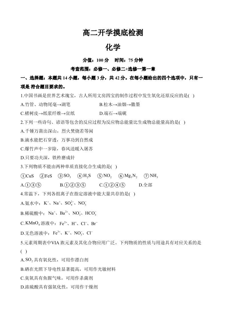 高二化学+答案--安徽省阜阳市临泉县田家炳实验中学(临泉县教师进修学校)2025-2026学年高二上学期开学考试