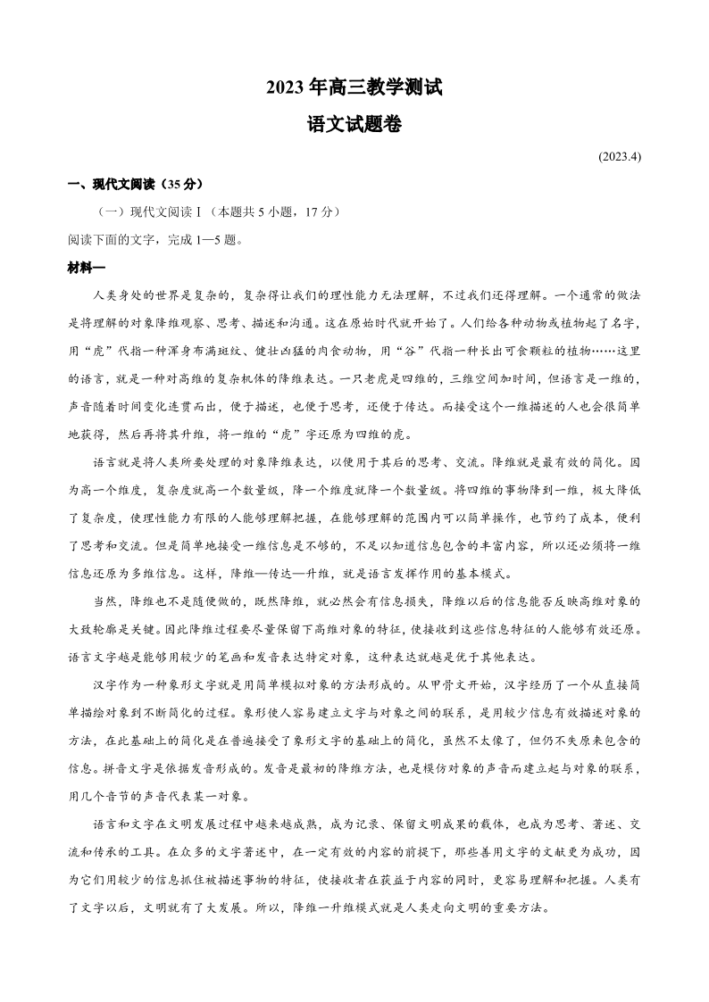 高三语文--浙江省嘉兴市2023届高三下学期4月第二次教学测试