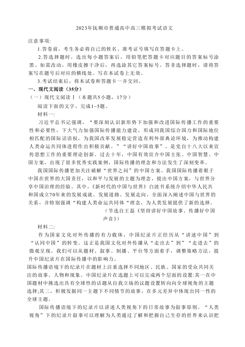 高三语文--辽宁省抚顺市普通高中2023高三第一次模拟考试