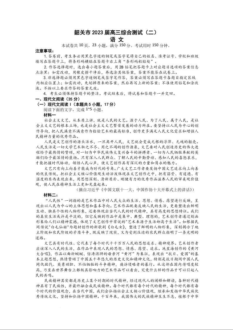 高三语文+答案--广东省韶关市2022-2023学年高三下学期第二次模拟考试