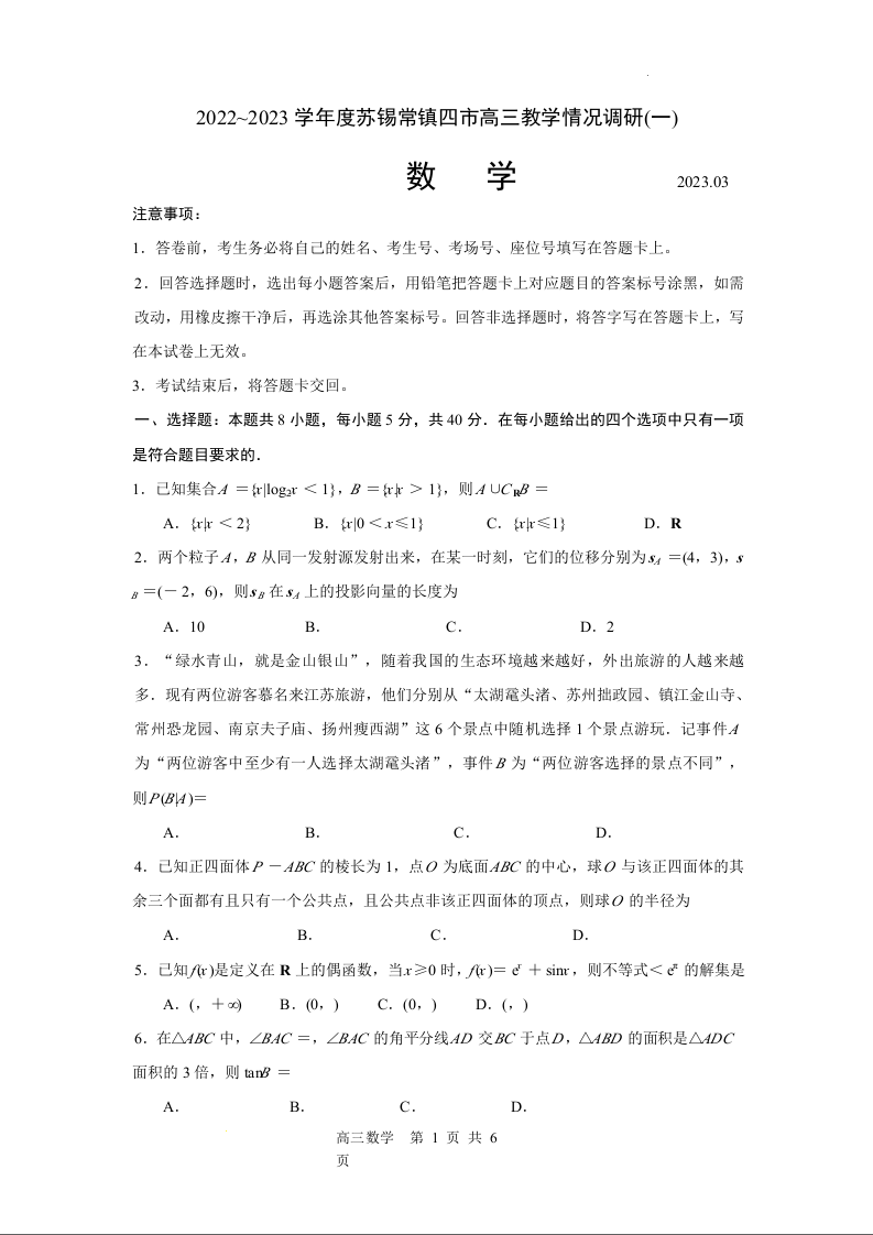 高三数学--江苏省苏锡常镇四市2023高三下学期教学情况调研(一)