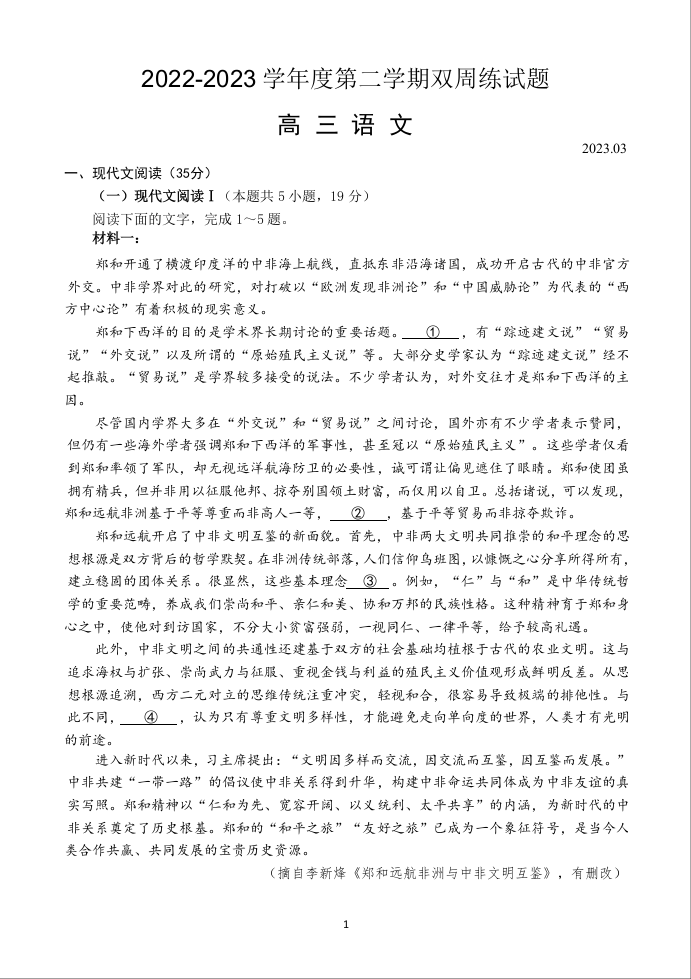高三语文+答案--江苏省扬州中学2023高三下学期3月月考