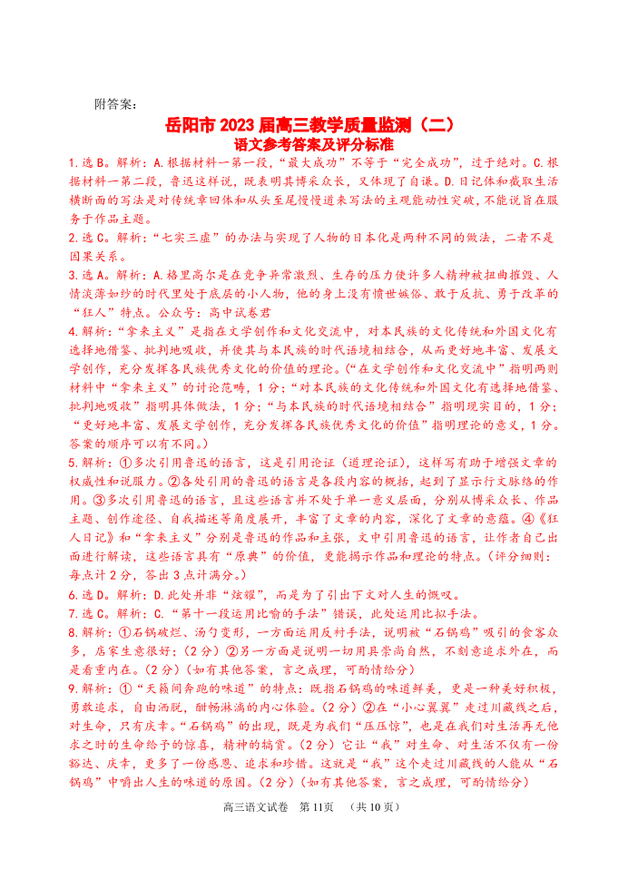 高三语文答案--湖南省岳阳市2023届高三下学期教学质量监测(二)