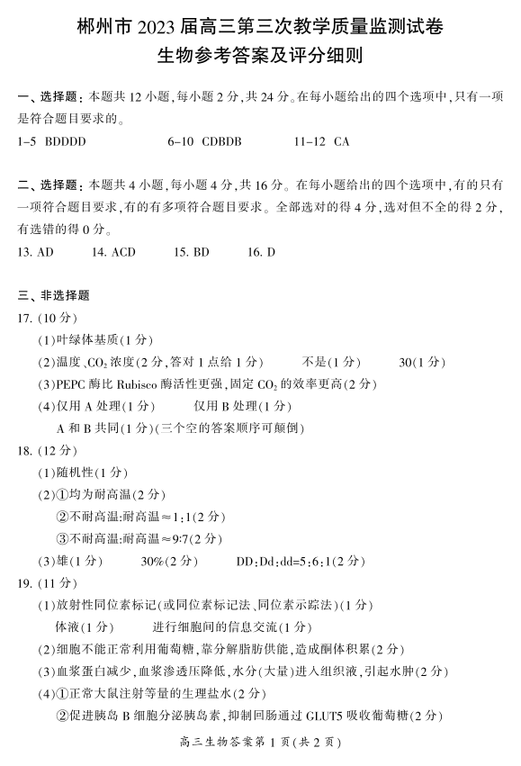 高三生物答案--湖南省郴州市2023届高三第三次质量检测