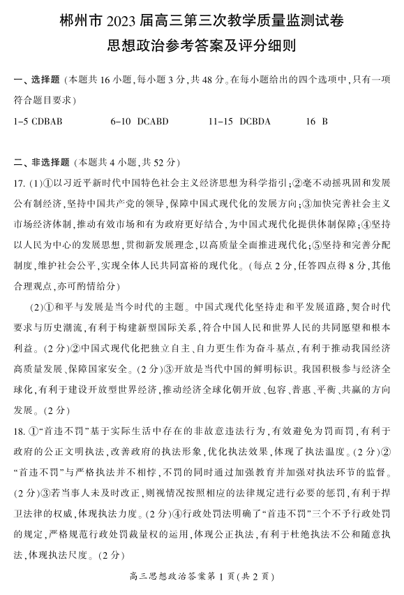 高三政治答案--湖南省郴州市2023届高三第三次质量检测
