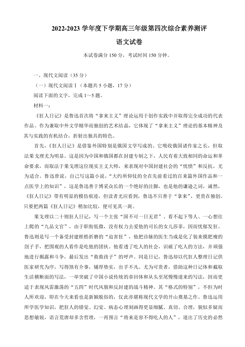 高三语文--河北省衡水中学2022—2023学年高三下学期第四次综合素养测评(衡中同卷)