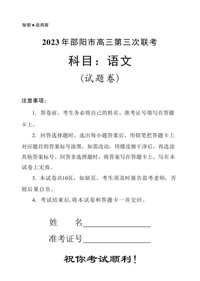 高三语文--湖南省邵阳市2023届高三第三次联考(三模)