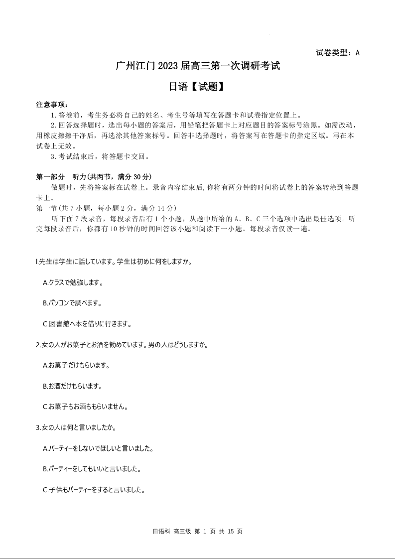 高三日语--广东省江门市2023届高考模拟考试(一模)