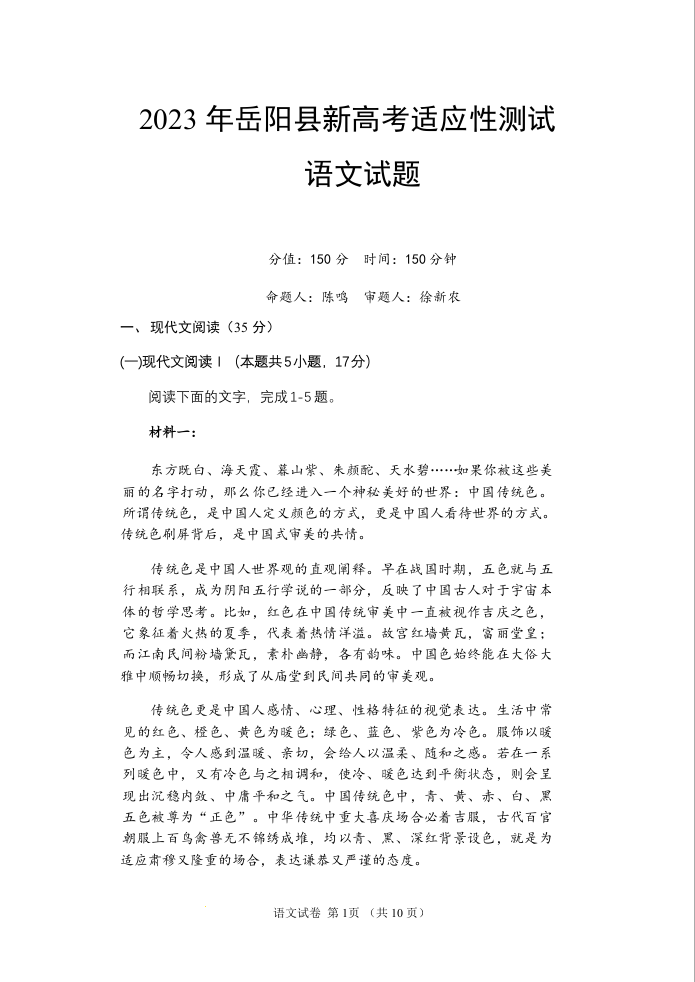 高三语文--湖南省岳阳市2023届高三新高考适应性测试