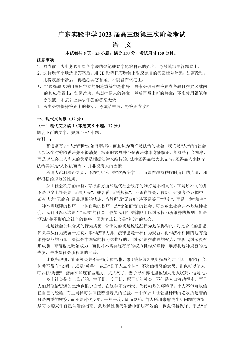 高三语文+答案--广东省广东实验中学2022-2023学年高三下学期第三次阶段考试