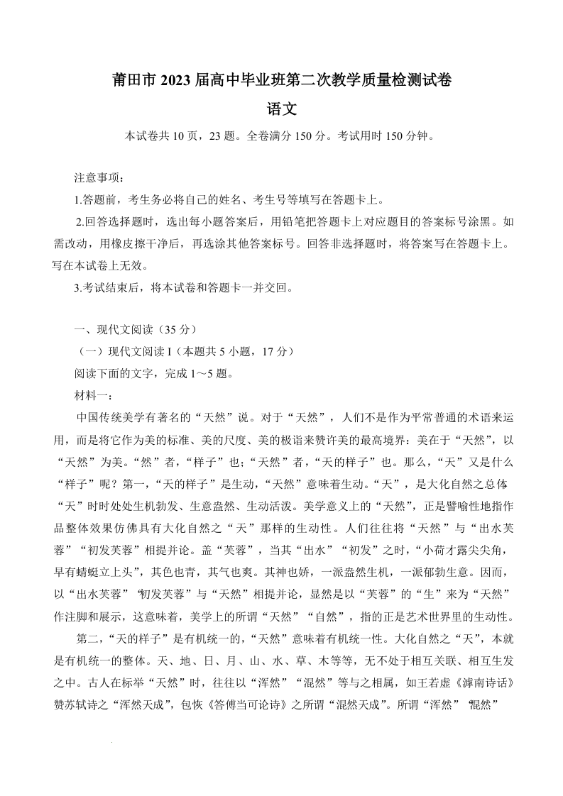 高三语文--福建省莆田市2023届高中毕业班第二次教学质量检测