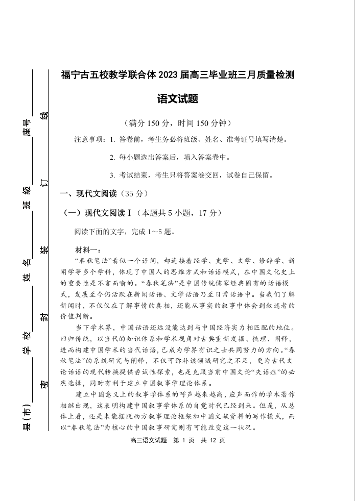 高三语文--福建省宁德市2023届五校教学联合体高三毕业班3月质量检测