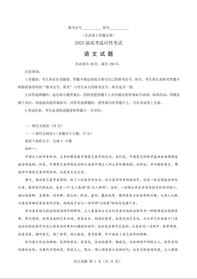 高三语文--福建省厦门双十中学2023届高三下学期二模