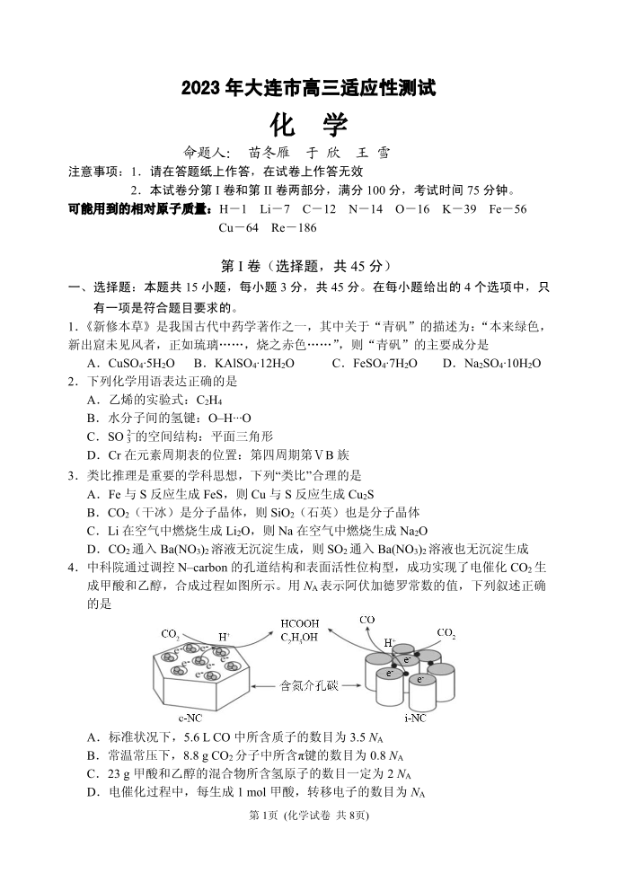 高三化学--辽宁省大连市2023届高三适应性测试(二)(大连二模)