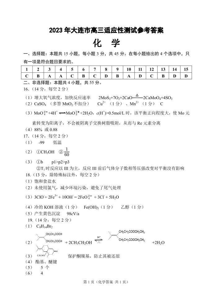 高三化学答案--辽宁省大连市2023届高三适应性测试(二)(大连二模)