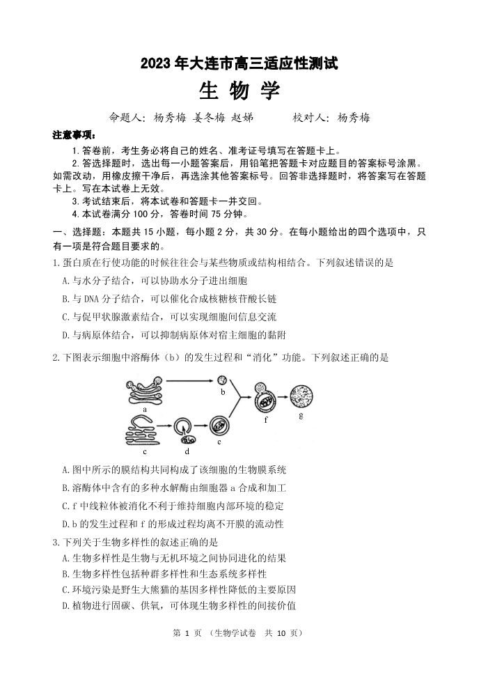 高三生物--辽宁省大连市2023届高三适应性测试(二)(大连二模)