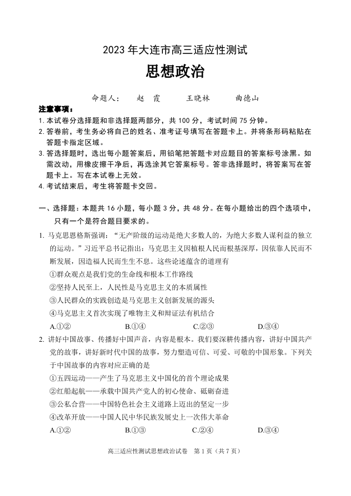 高三政治--辽宁省大连市2023届高三适应性测试(二)(大连二模)