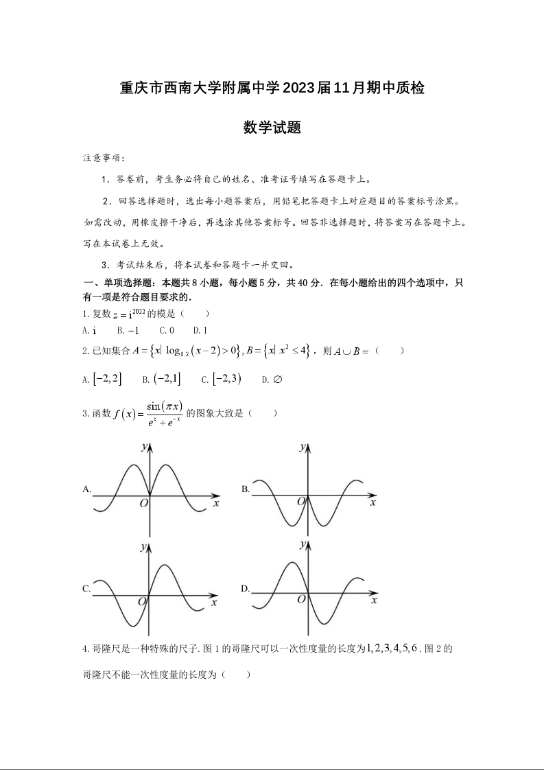 高三数学+答案--重庆市西南大学附属中学2023届11月期中质检