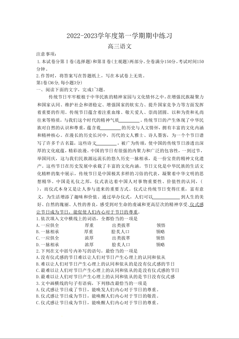 高三语文+答案--天津市部分区2023届高三上学期期中考试