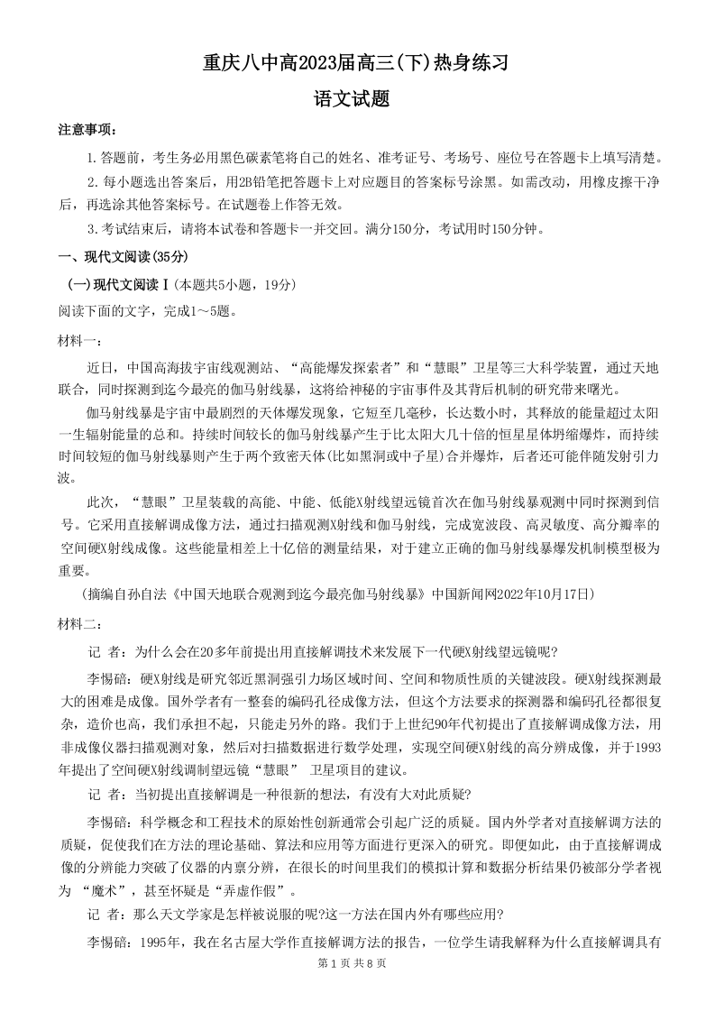 高三语文--重庆市第八中学高2023届高三(下)热身练习
