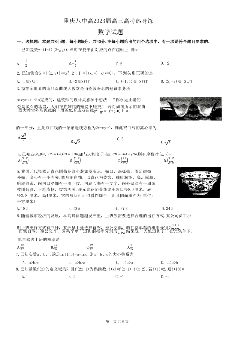 高三数学--重庆市第八中学高2023届高三(下)热身练习