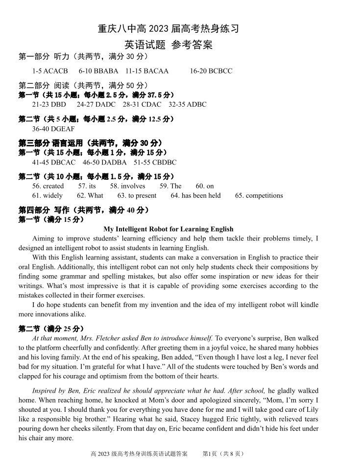 高三英语答案--重庆市第八中学高2023届高三(下)热身练习