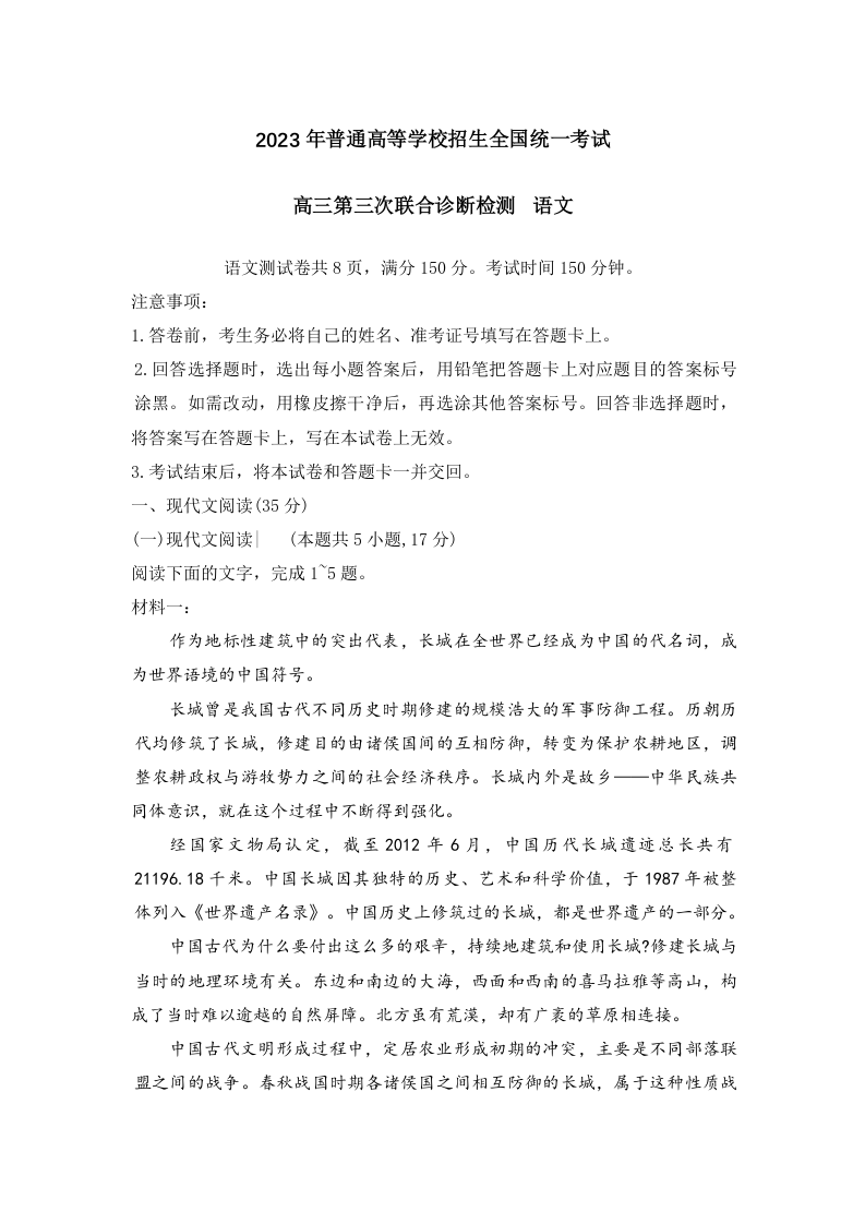 高三语文--重庆三诊康德卷 2023年普通高等学校招生全国统一考试高三第三次联合诊断检测