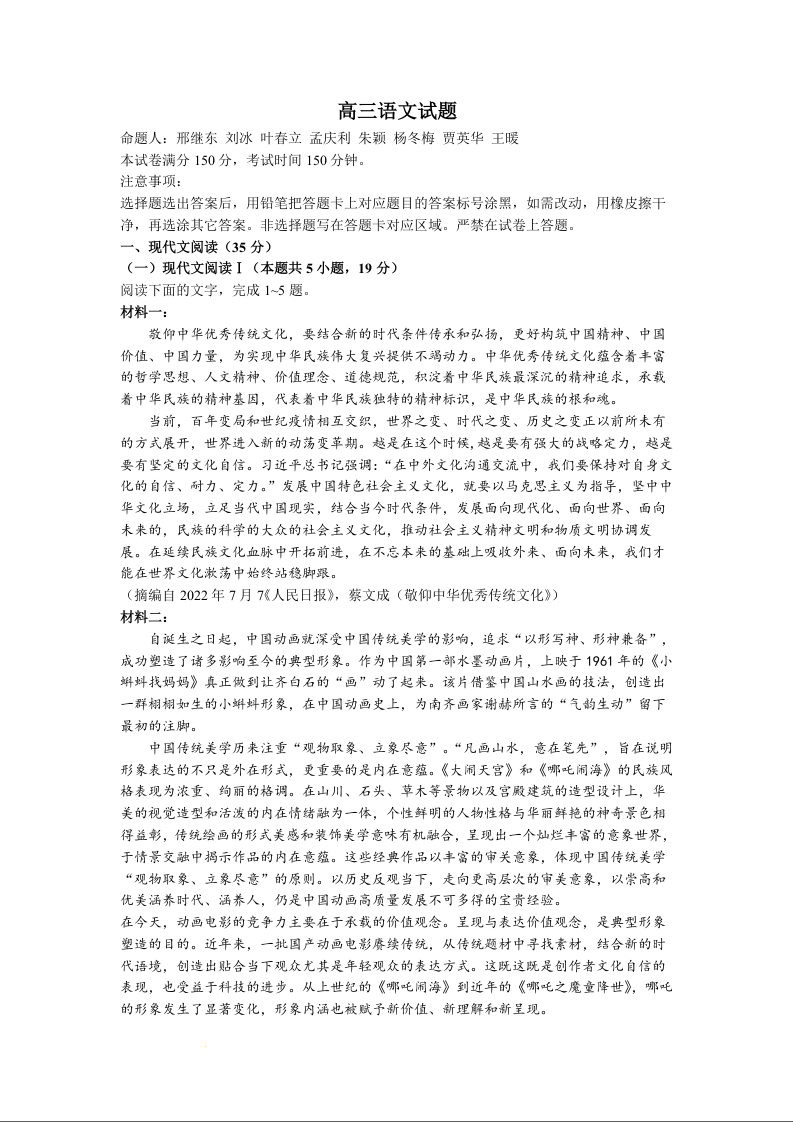 高三语文+答案--山东省德州市2023届高三上学期11月期中考试