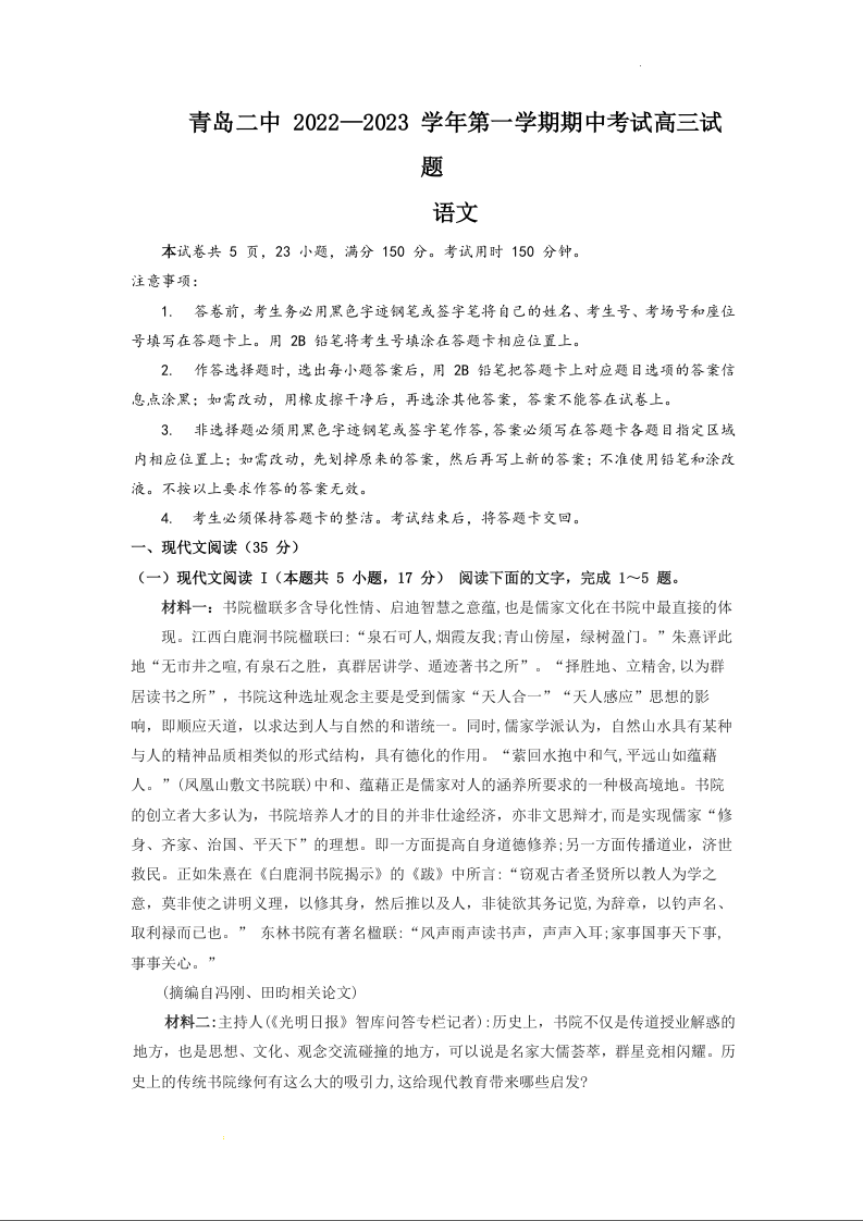 高三语文--山东省青岛第二中学2023届高三上学期11月期中考试