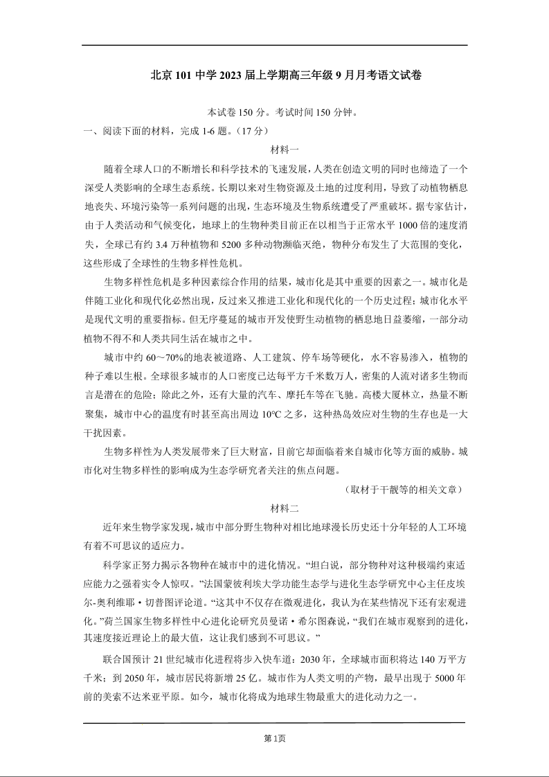 高三语文+答案--北京市海淀区北京2023届一零一中学高三上学期9月月考