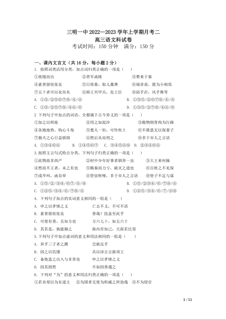 高三语文--福建省三明第一中学2023届高三上学期第二次月考