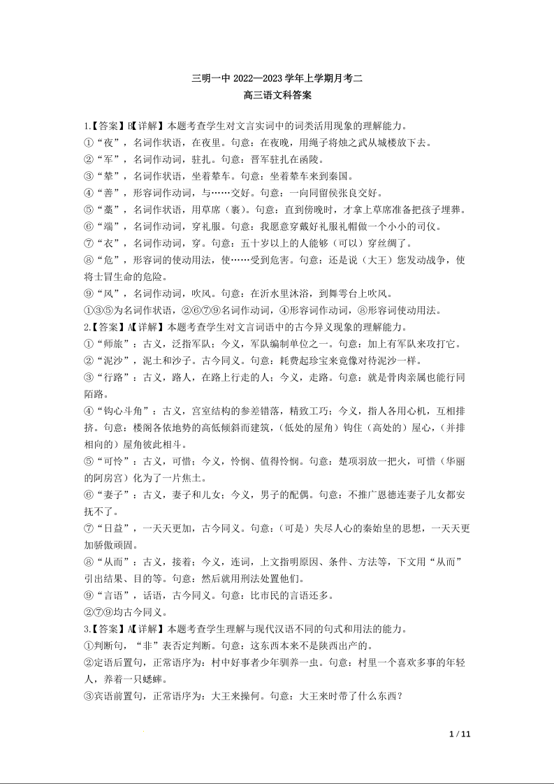 高三语文答案--福建省三明第一中学2023届高三上学期第二次月考
