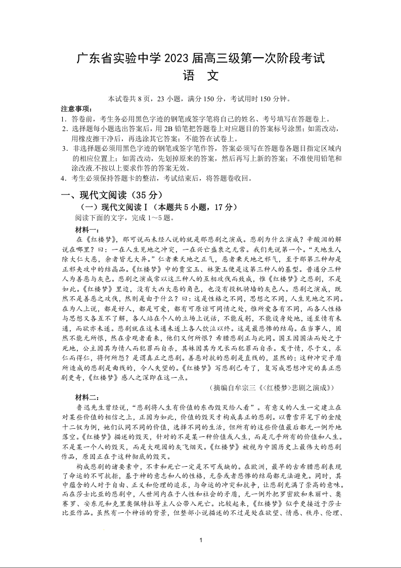 高三语文+答案--广东省实验中学2023届高三上学期第一次阶段考试