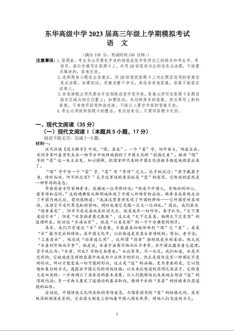 高三语文+答案--广东省东华高级中学2023届高三上学期模拟考试