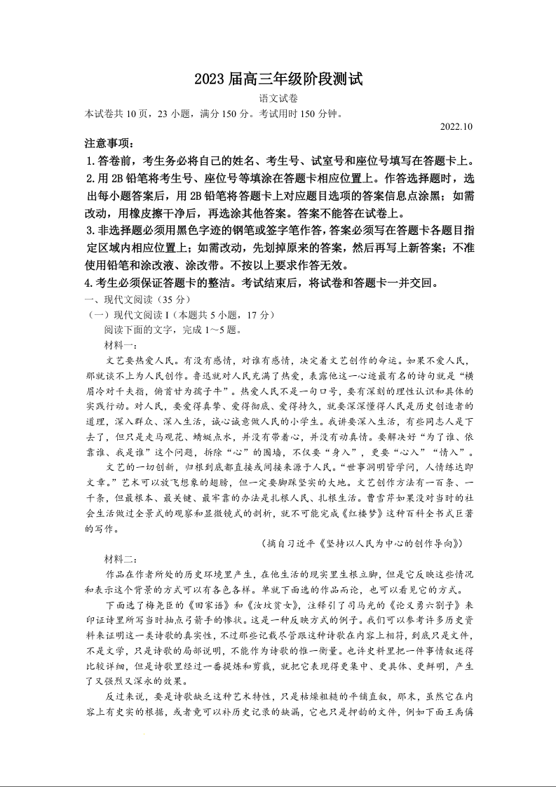 高三语文+答案--广东省广州市越秀区2023届高三上学期10月统考