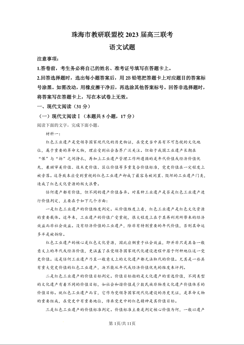 高三语文--广东省珠海市教研联盟校(两校)2023届高三上学期10月联考