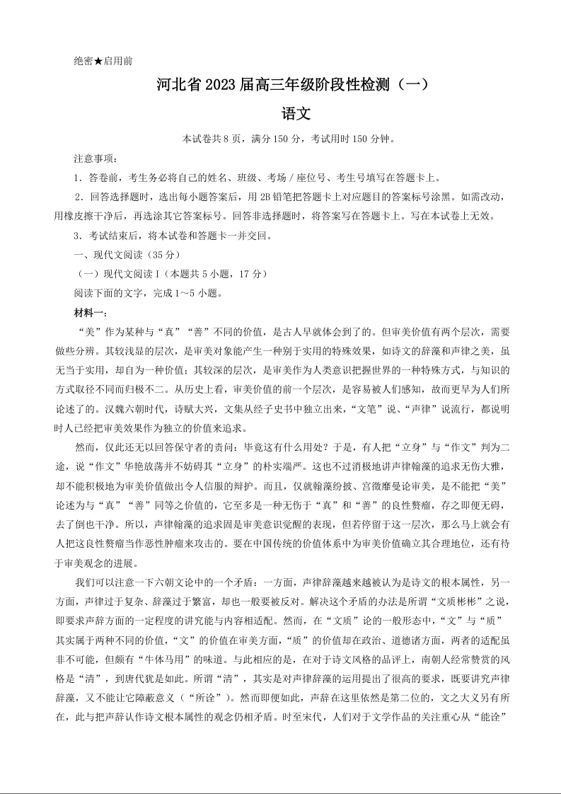 高三语文--河北省部分重点中学2023届高三上学期阶段性检测(一)
