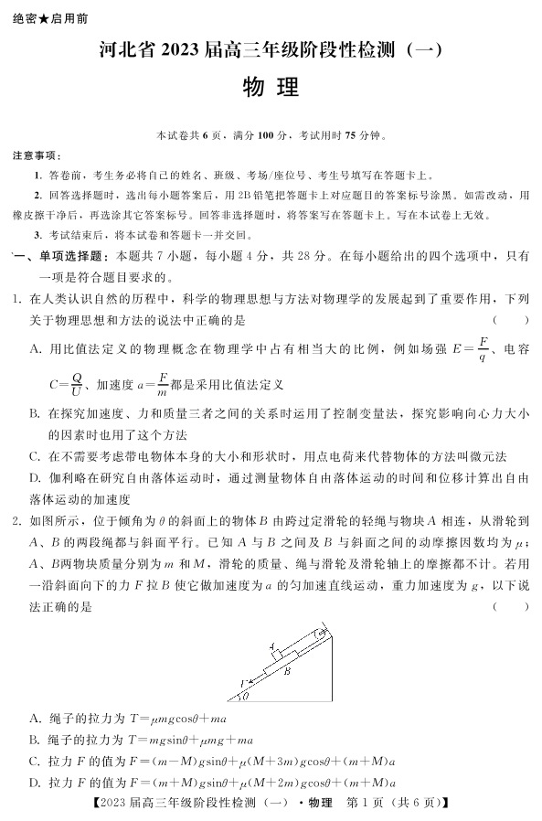 高三物理--河北省部分重点中学2023届高三上学期阶段性检测(一)